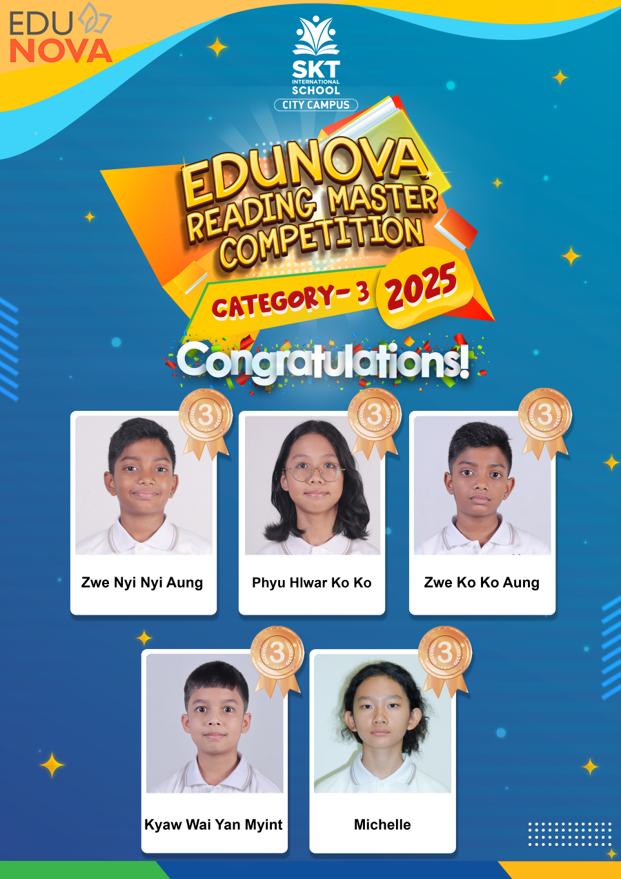 EDUNOVA စာဖတ်ပြိုင်ပွဲ ၂၀၂၅ က ကြီးမားတဲ့အောင်မြင်မှုတစ်ရပ်ဖြစ်ခဲ့ပါတယ်....။ ကျွန်မတို့ကျောင်းသား၊ ကျောင်းသူအားလုံးအတွက် ဂုဏ်ယူဝမ်းမြောက်ရပါတယ်.....။ ကျောင်းသားကျောင်းသူလေးတို့ဟာ စာဖတ်ခြင်းရဲ့ တန်ဖိုးနဲ့ ပျော်ရွှင်မှုကို ပြသနိုင်ခဲ့ကြပြီး စာအုပ်တစ်အုပ်ချင်းစီတိုင်းက သူတို့လေးတွေကို ပိုပြီး ကြံ့ခိုင်လာစေ၊ ပိုတော်လာစေခဲ့တာဖြစ်ပါတယ်...။